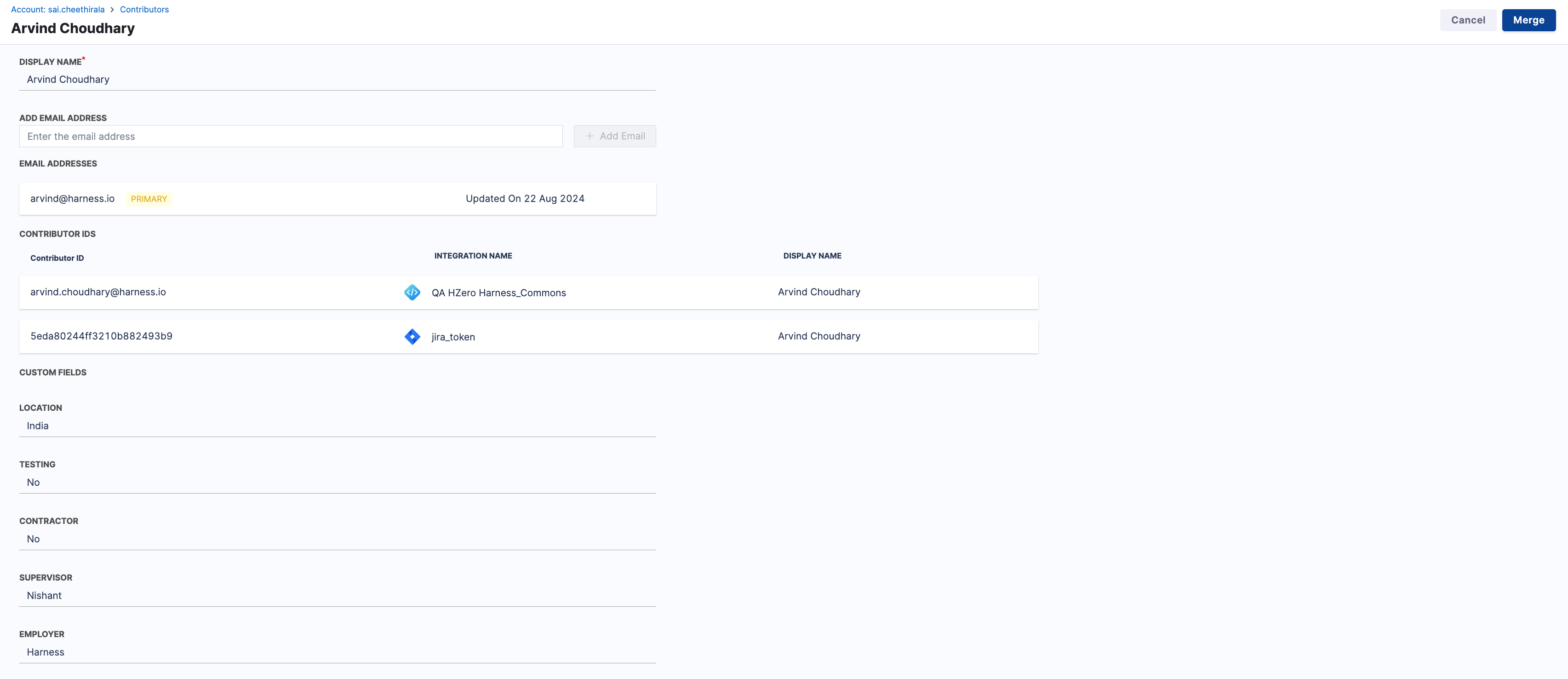 - Identify the duplicate contributor profiles. For example: A contributor with the Harness Code integration and an associated email and the same contributor with the Jira integration but without an associated email.