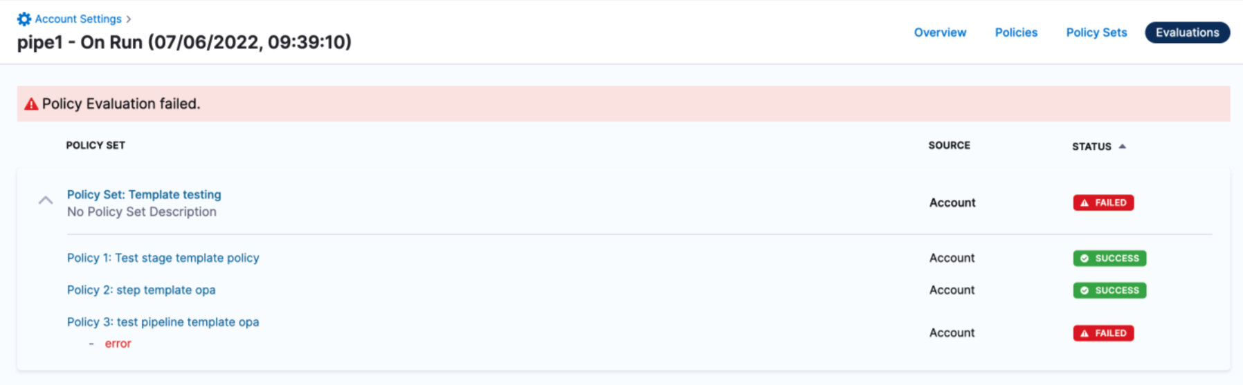 Contact your Harness account administrator to resolve the issue. If the policy set has an error, you can disable it by locating the policy set and turning off the Enforced toggle.