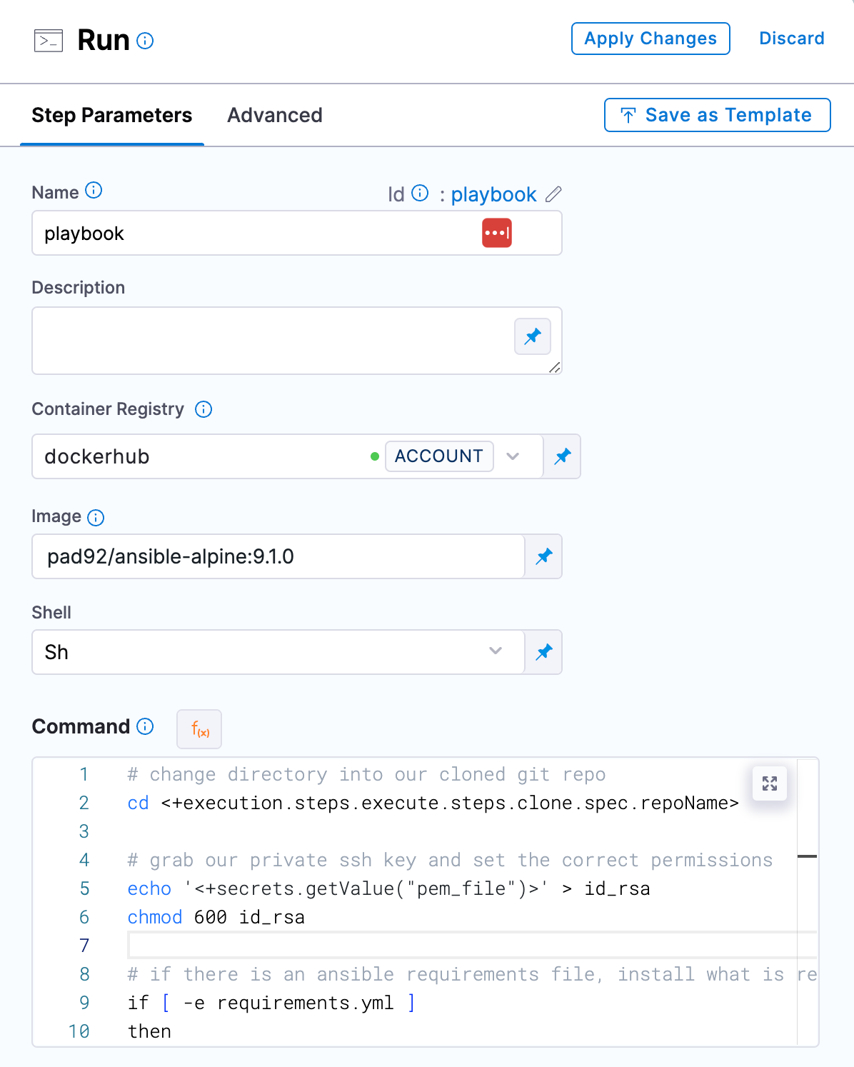 ansible-playbook --private-key=id_rsa -i <+execution.steps.ansible.variables.host_file> -e '<+execution.steps.ansible.variables.extra_vars>' <+execution.steps.ansible.variables.playbook>
