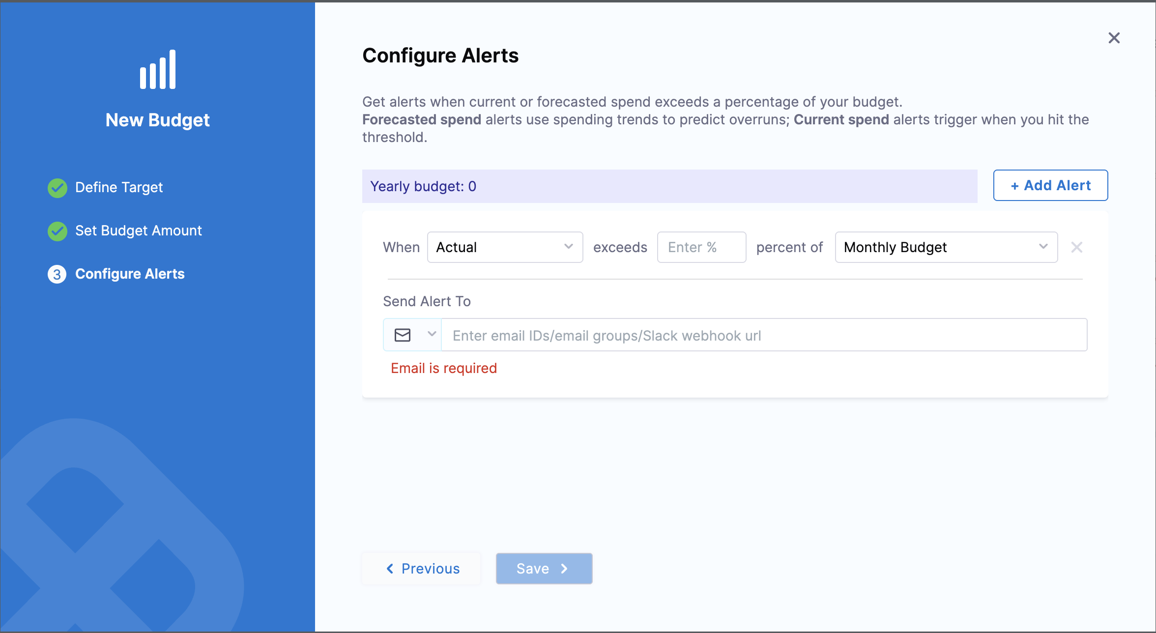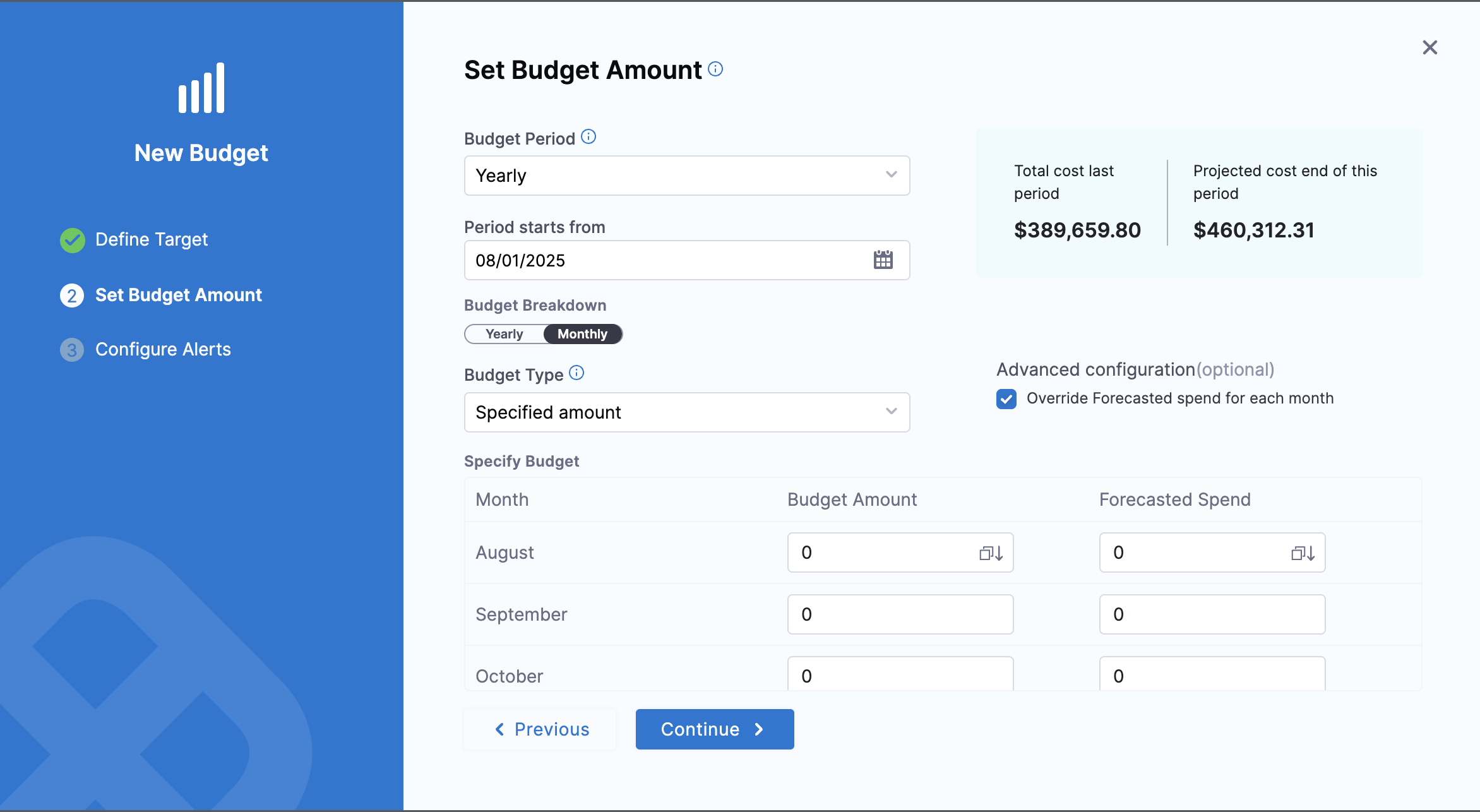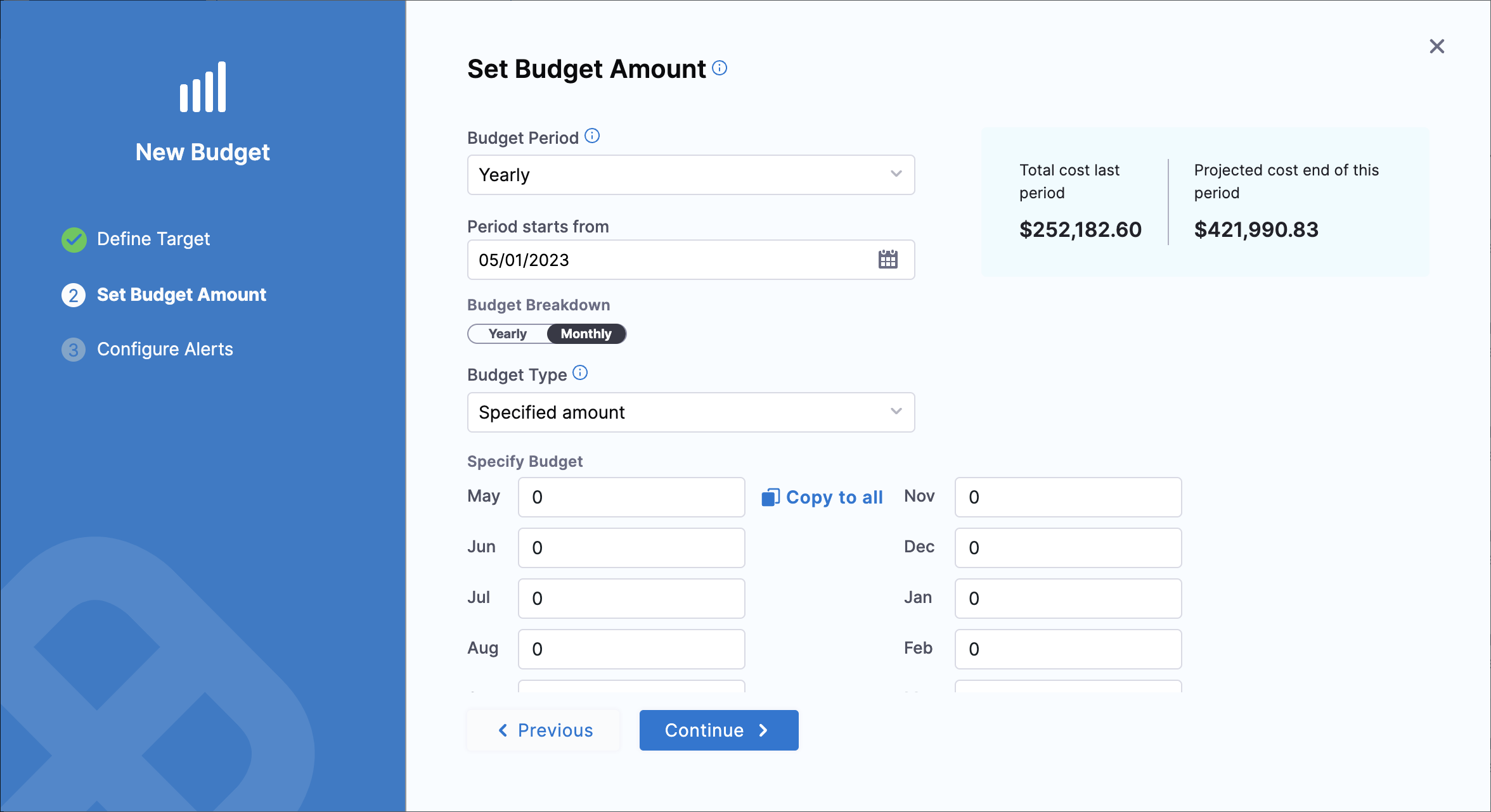 - Monthly alerts for Yearly Budgets: Define a spend threshold for each month within an yearly budget and receive alerts as soon as that month’s spend approaches the limit. [CCM-24187]