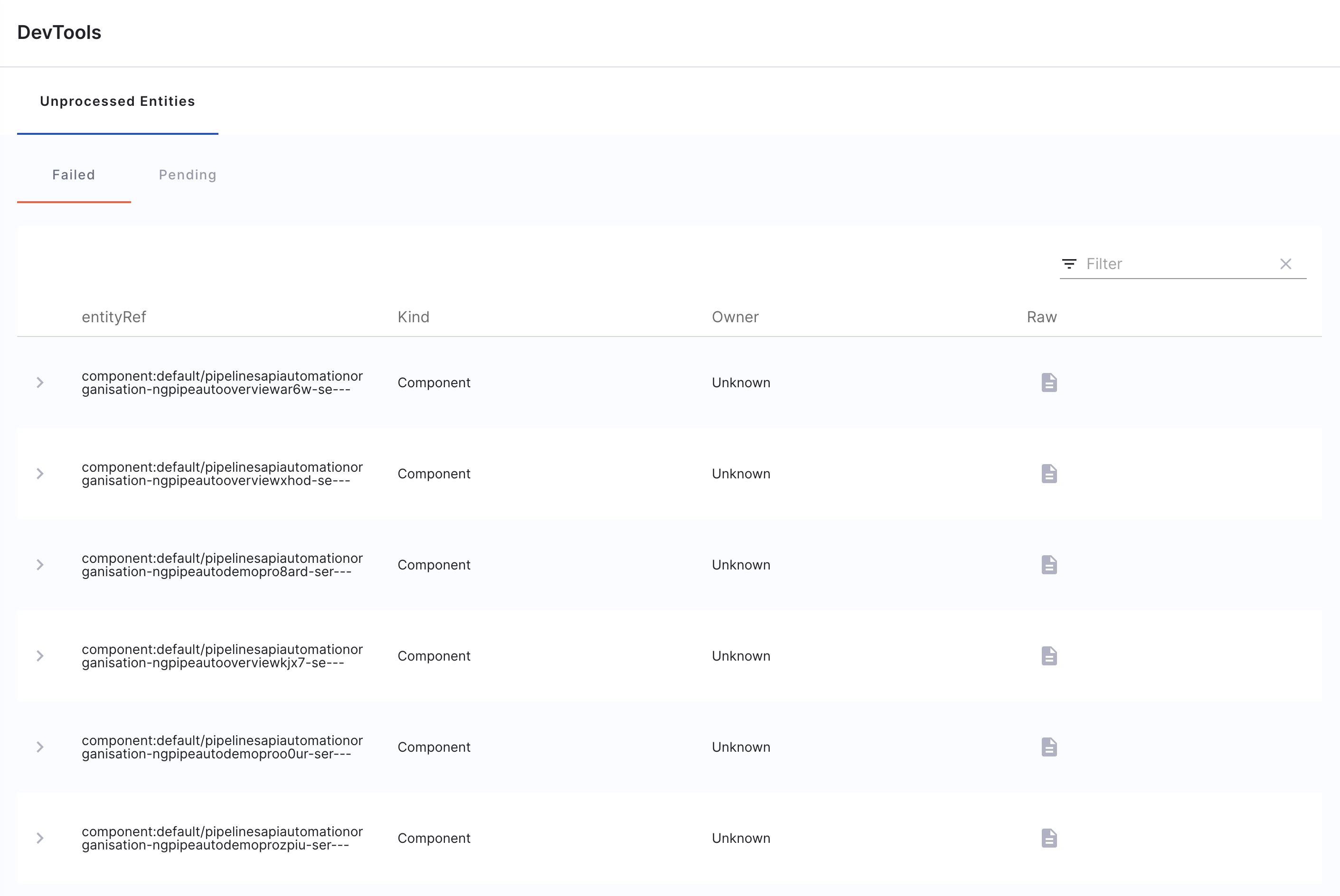 - The Entities tab offers a searchable, filterable, and sortable table of all Components, APIs, and Resources within the System.