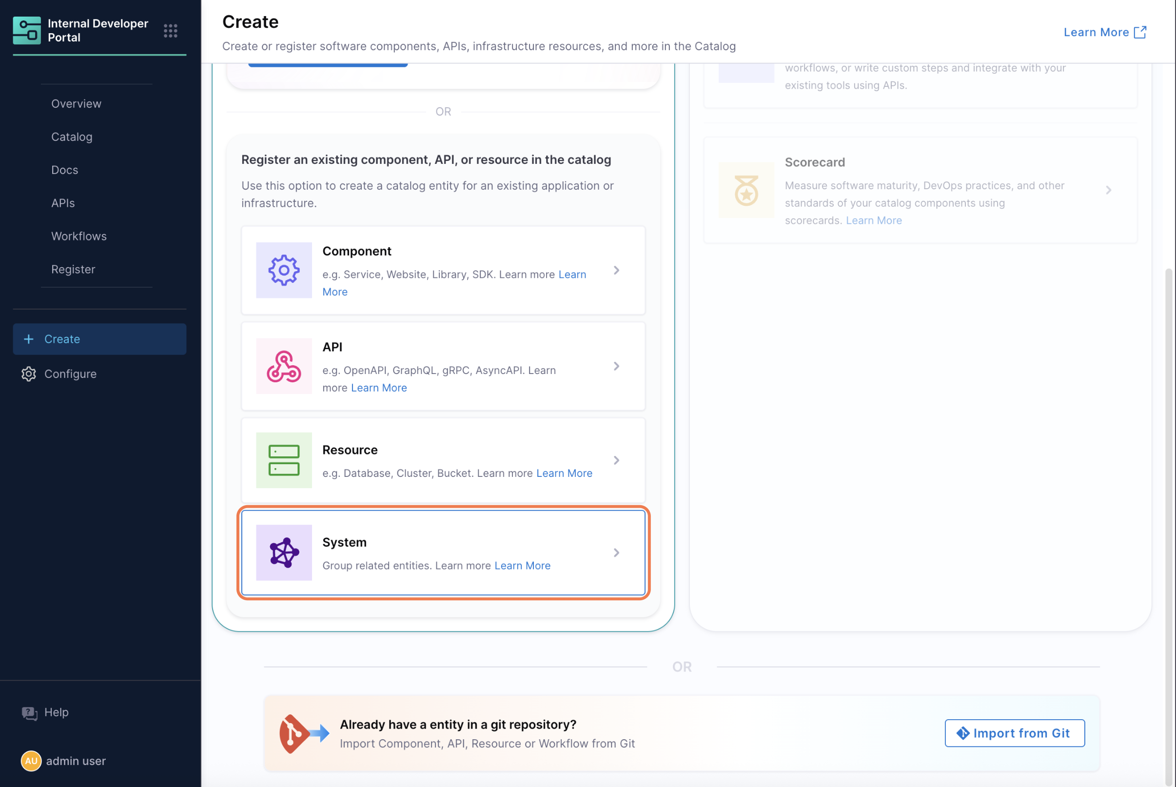 - Define Systems using the IDP UI, YAML, or the Create Entity API (